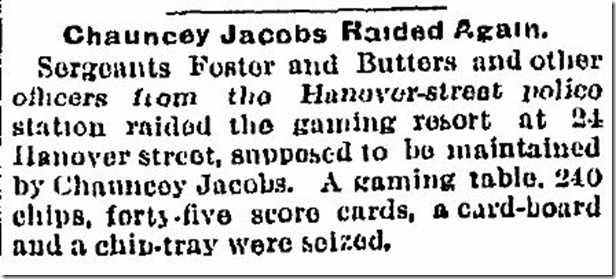 | It is documented that there was an illegal gambling joint at 24 Hanover street between 1882 and 1891. The operation was run Chauncey Jacobs. The newspaper clippings below document 11 police raids. I'm sure there were many raids that eluded my search. I believe that the gambling operation had to be run with the tacit approval of the police. The raids appear to have been for "show". Having the approval of the law would help explain why an illegal gambling operation would put the address of its establishment on its gaming checks. Note that Sergeants Butters and Foster attended most raids. It appears that Jacobs catered toward students from Harvard. | |||||||||||||